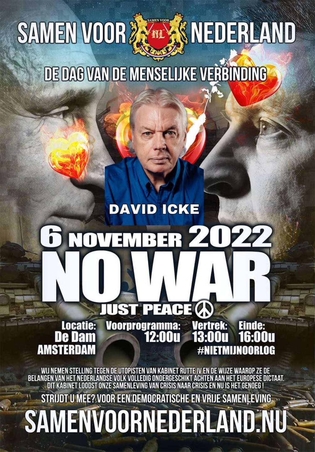 On Sunday 6 November there’ll be another march for connection organized by ‘Samen voor Nederland’. This time it’s called the March of Peace. The war in Ukraine is not our war. It’s an excuse to create more crisis in order to strip people even more financially and take them out of their power. In war only the arms suppliers win.