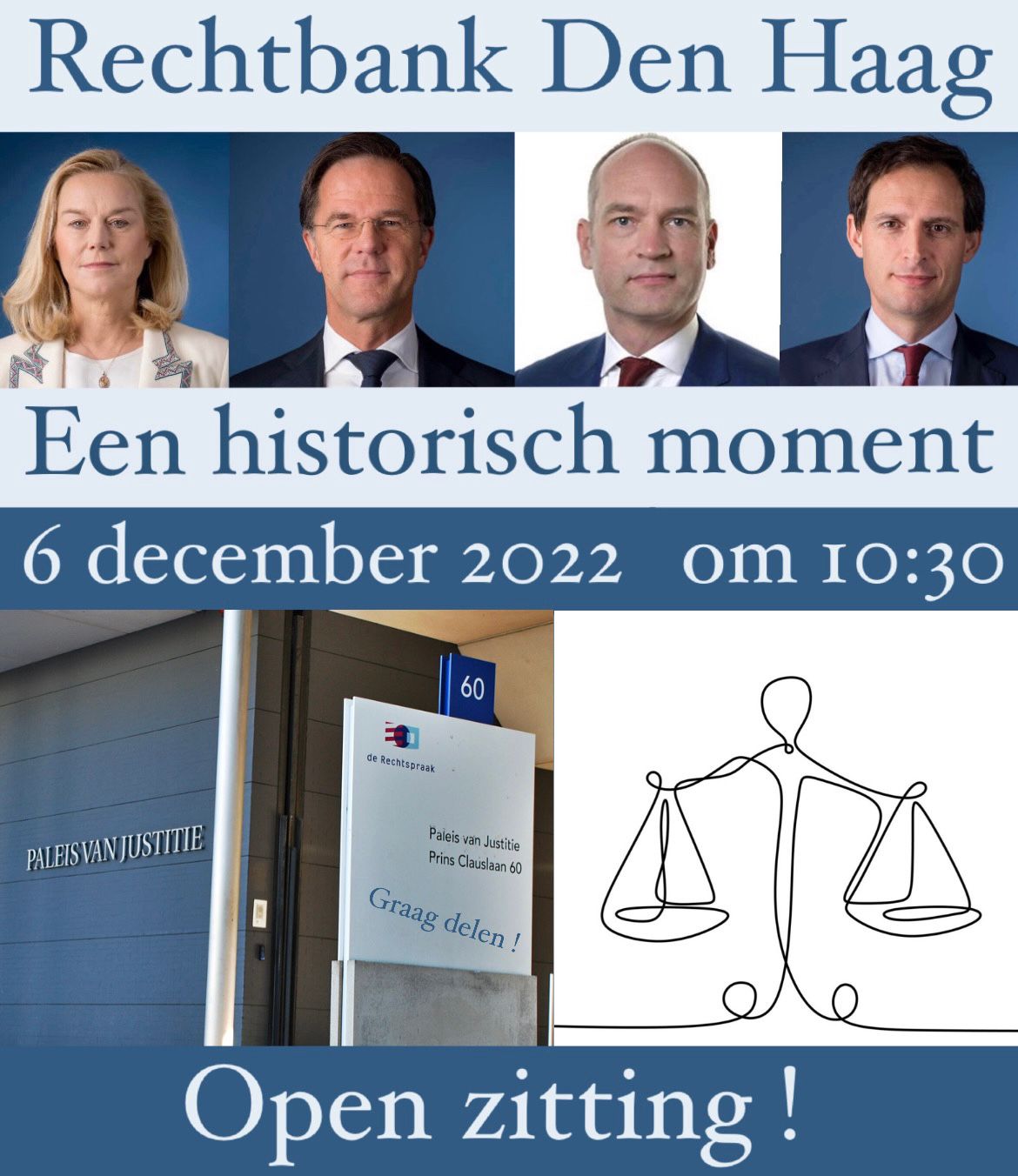 Op dinsdag 6 december om 11.00 uur is de rolzitting tegen premier Rutte en de ministers Kaag en Hoekstra en politicus Segers in de Rechtbank van Den Haag, aangespannen door Nationale bond tegen Overheidszaken. Het weer buiten is aan de koude kant en droog.